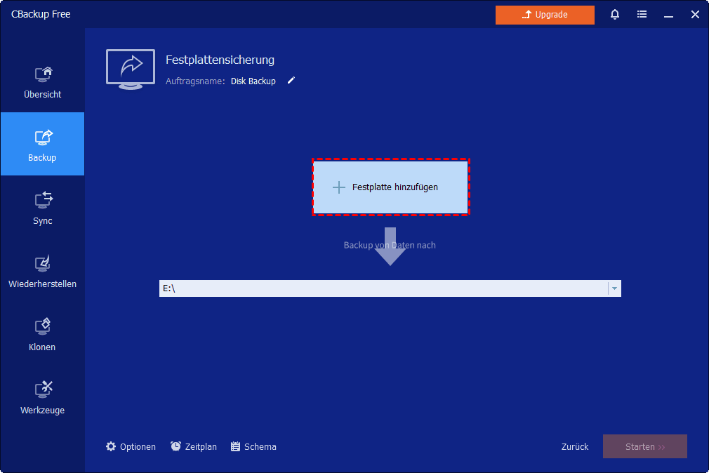 1. Klicken Sie auf „Festplatte hinzufügen“, um die Festplatte auszuwählen, die Sie sichern möchten. Außerdem können Sie diese Sicherung über das Feld „Aufgabenname“ umbenennen, um sie leichter von anderen Sicherungen zu unterscheiden.
