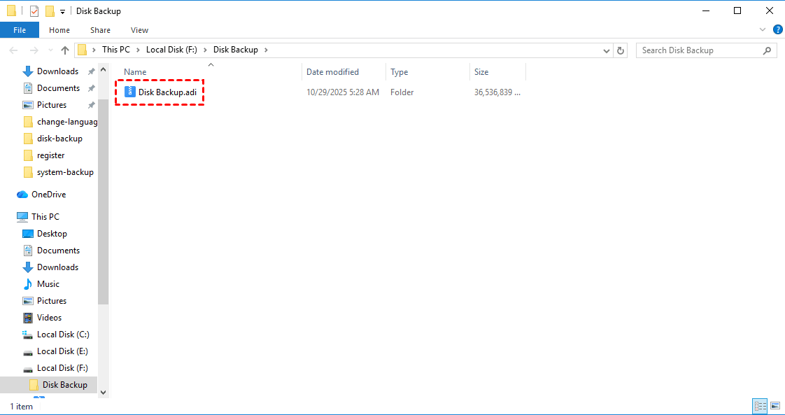 5. Anschließend können Sie zum Zielort wechseln und überprüfen, ob ein Backup-Image (.adi) vorhanden ist. Danach können Sie Ihr System und Ihre Daten im Falle eines Systemabsturzes oder einer Festplattenbeschädigung problemlos wiederherstellen. Weitere Informationen zu den Wiederherstellungsschritten finden Sie unter Festplattenwiederherstellung.