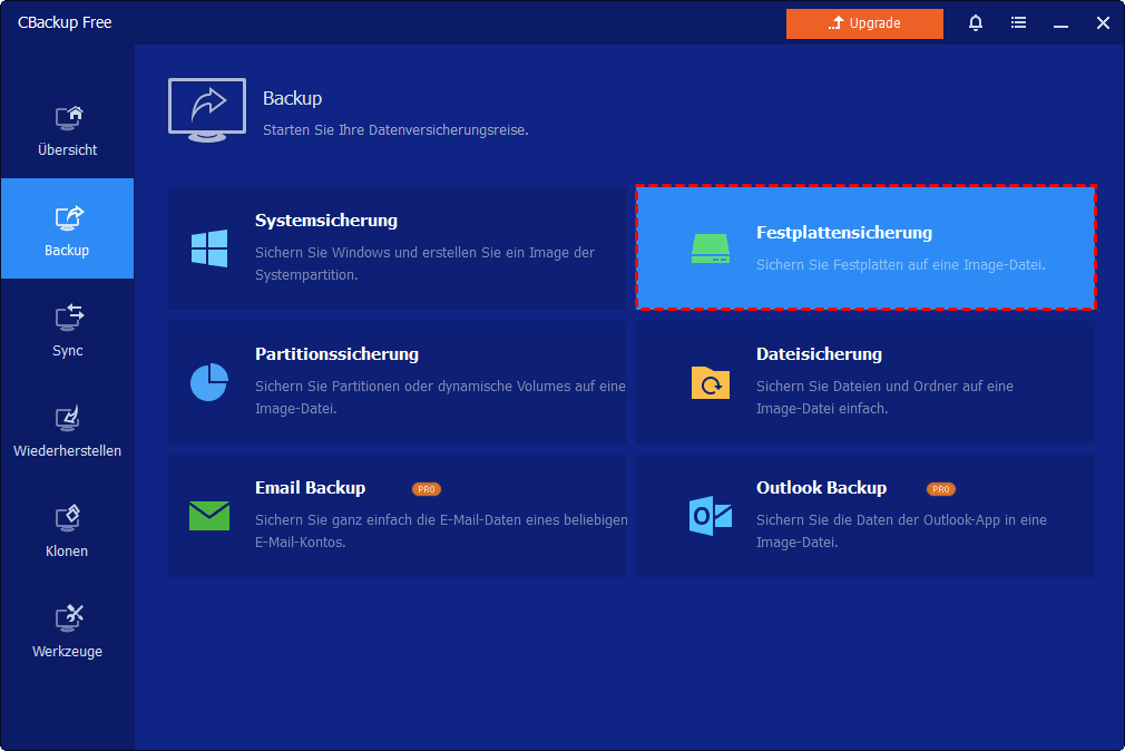 Wählen Sie auf der linken Registerkarte „Backup“ und dann „Festplattensicherung“.