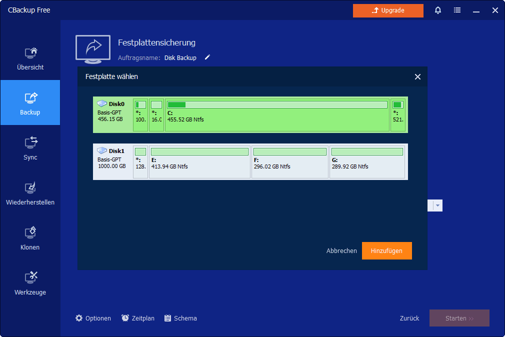 Tipp: Wenn Sie mehrere Festplatten als Quellen für die Sicherung hinzufügen, müssen Sie diese bei der Wiederherstellung nacheinander wiederherstellen.