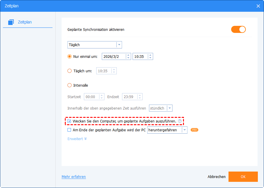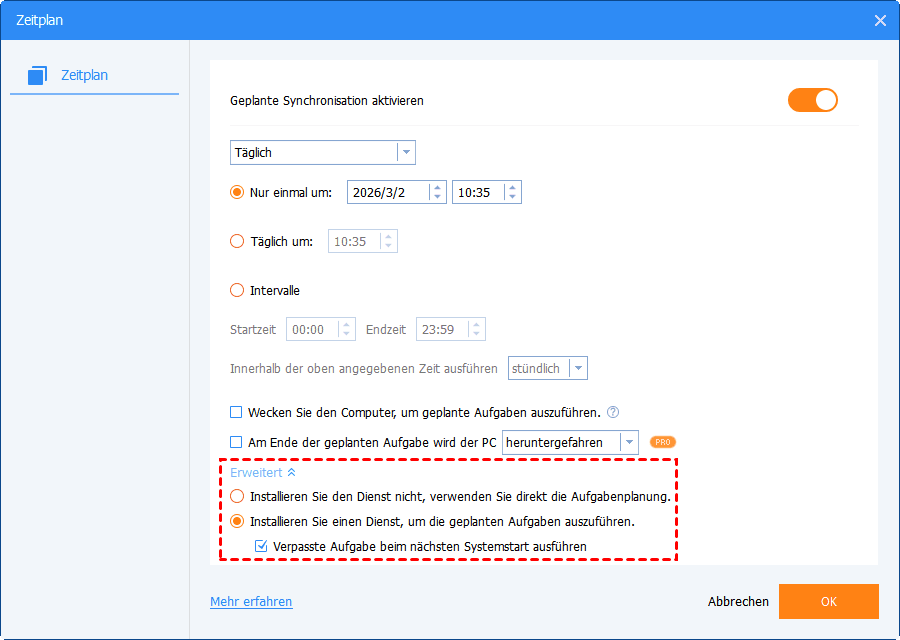 In den „Erweitert“-Zeitplaneinstellungen können Sie „Verpasstes Backup beim nächsten Systemstart ausführen“ aktivieren, sodass ein verpasstes Backup beim nächsten Systemstart ausgeführt wird, wenn der PC vor dem geplanten Sicherungszeitpunkt heruntergefahren wurde.