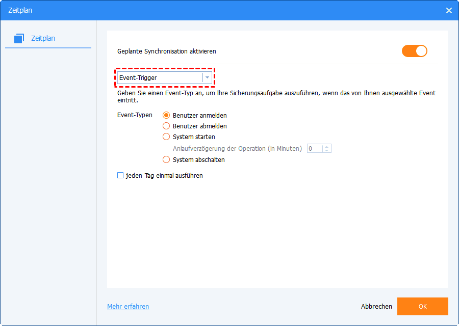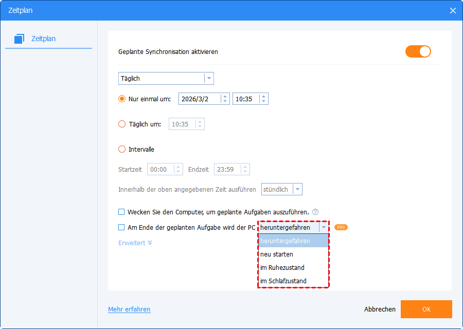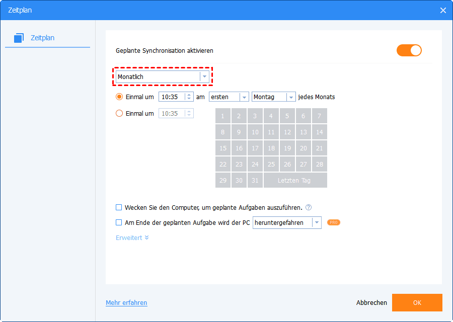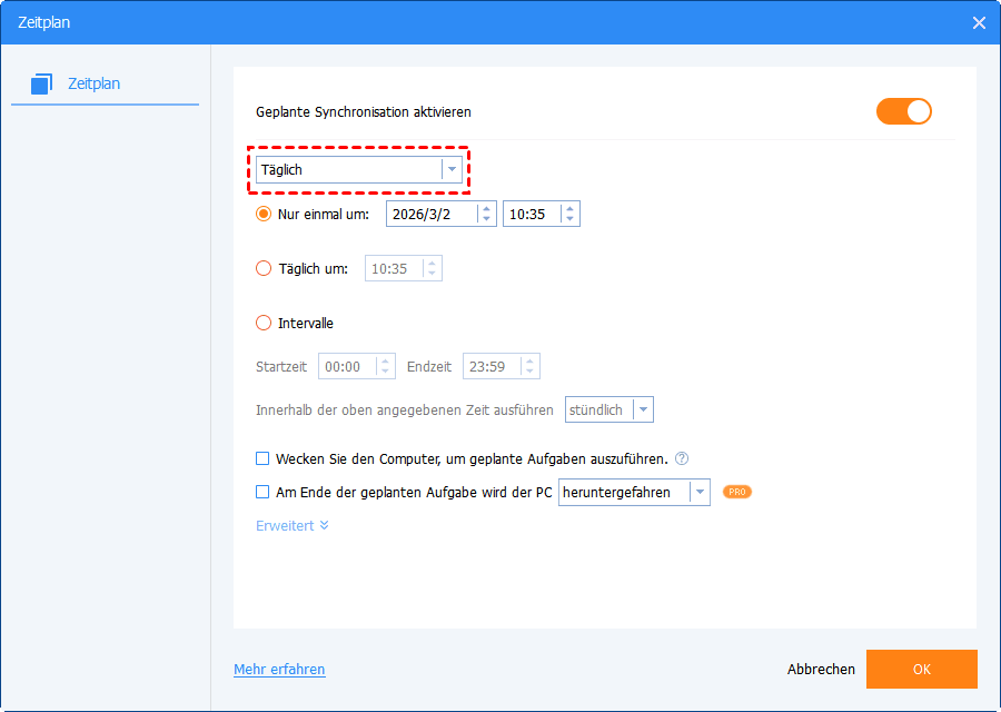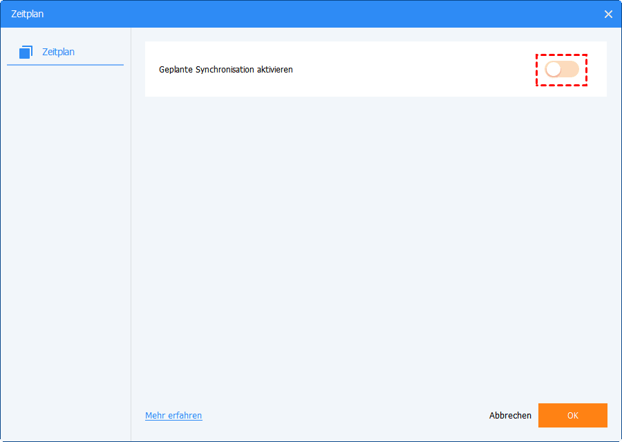 Tipps: Die geplante Synchronisierung ist nur in der grundlegenden Synchronisation, der Spiegelsynchronisation und der Zwei-Wege-Synchronisation verfügbar. Die Echtzeit-Synchronisation kann als speziell geplante Synchronisierung betrachtet werden.