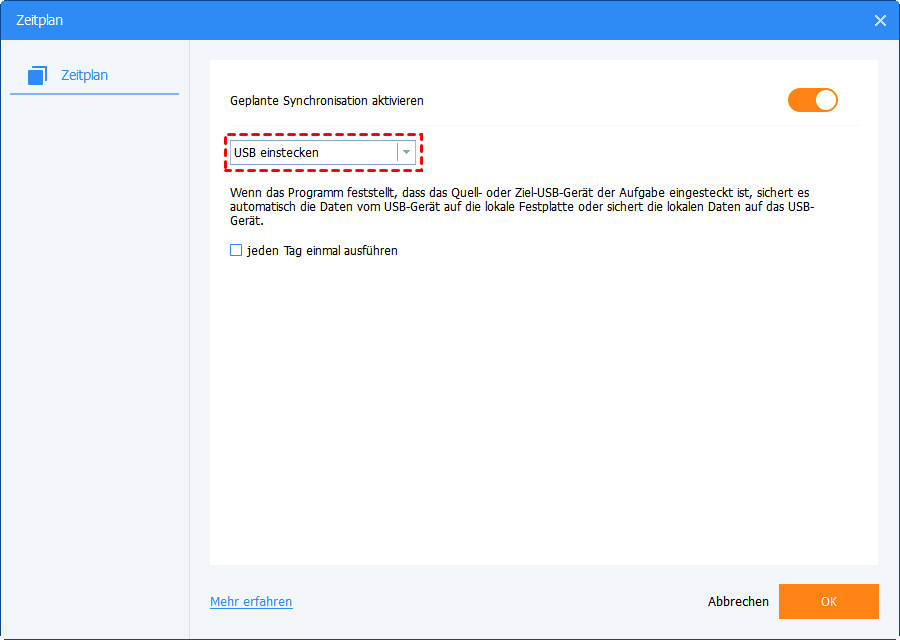 Wenn das Programm erkennt, dass das mit der Sicherungsaufgabe verknüpfte Quell- oder Ziel-USB-Gerät angeschlossen wird, sichert es die Daten automatisch von dem USB-Gerät oder sichert die Daten auf das USB-Gerät.