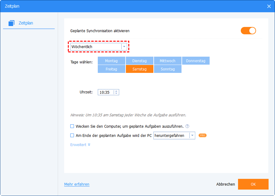 Stellen Sie die gewünschte Startzeit ein und das Programm führt die Synchronisierung zu dieser Zeit automatisch an den ausgewählten Tagen jede Woche durch.