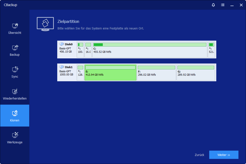- Wenn Sie zusätzlich die Datenpartitionen auf der Systemfestplatte klonen möchten, können Sie die Funktion Festplattenklon verwenden.