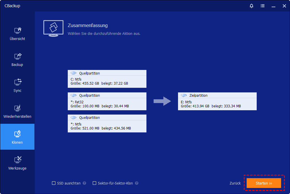 Anschließend gelangen Sie zum Fenster „Zusammenfassung“, bestätigen die Laufwerksinformationen und klicken auf „Starten“, um das System auf die SSD oder HDD zu klonen.
