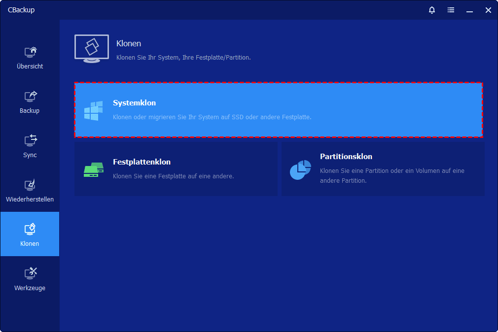 Starten Sie die Systemmigrationssoftware CBackup Professional. Klicken Sie in der linken Spalte auf „Klonen“ und wählen Sie dann „Systemklon“.
