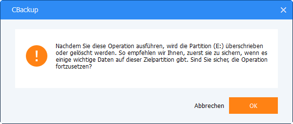 Wenn der ausgewählte Zielspeicherort partitioniert ist, wird ein Fenster angezeigt, in dem Sie darauf hingewiesen werden, dass diese Partition gelöscht oder überschrieben wird. Klicken Sie auf „OK“, um fortzufahren. Stellen Sie sicher, dass sich keine wichtigen Daten auf dieser Partition befinden, da diese sonst überschrieben werden.