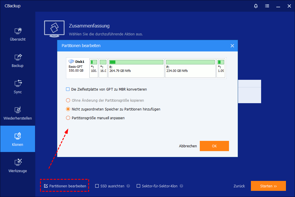 Alternativ können Sie während des Klonvorgangs mit der Funktion „Partitionen bearbeiten“ die Größe der Zielpartitionen manuell anpassen.
