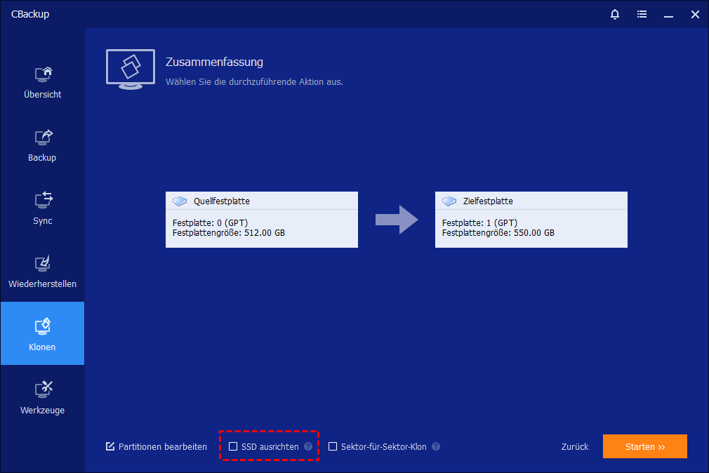 | SSD ausrichten | Wenn Ihre Zielfestplatte eine SSD ist | Optimiert die Partitionierung für maximale Lese- und Schreibgeschwindigkeit |