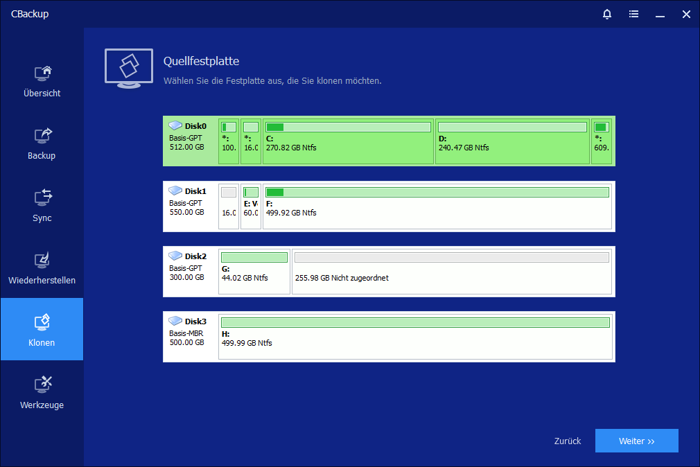 • CBackup öffnen und im Menü auf „Klonen“ klicken.