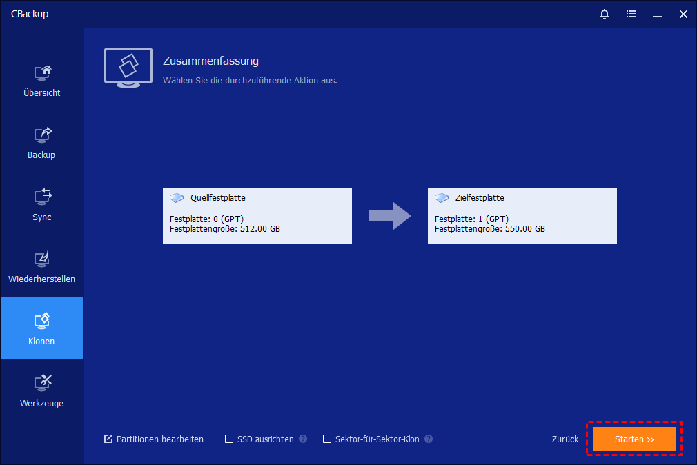 • Nachdem Sie alle Einstellungen vorgenommen haben, klicken Sie auf „Starten“. Der Klonvorgang beginnt.